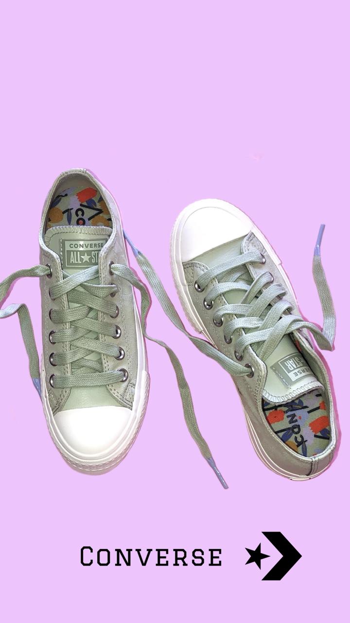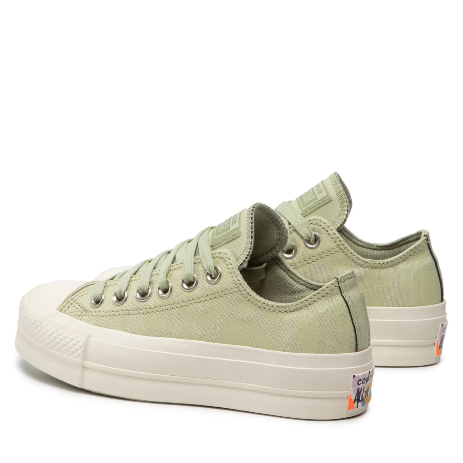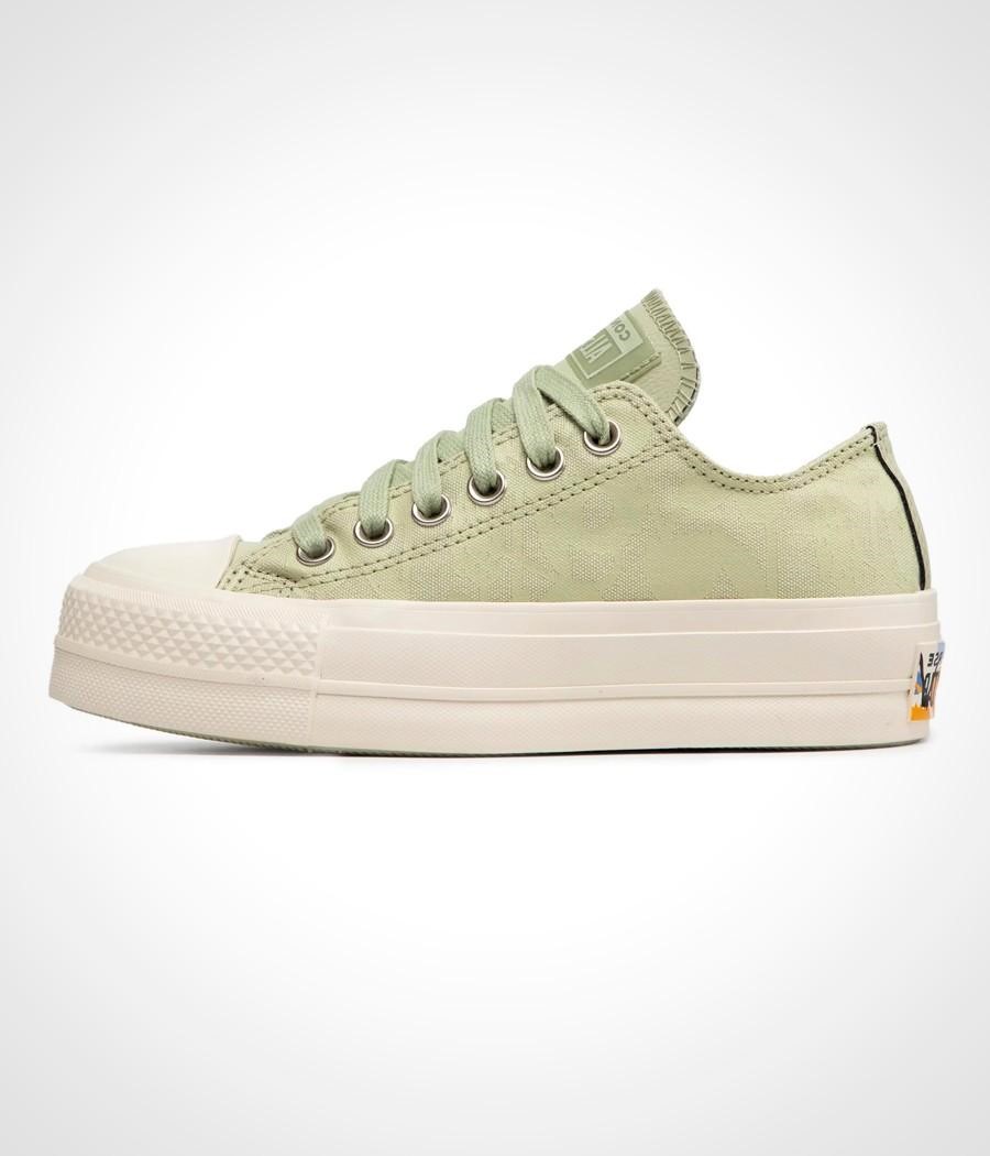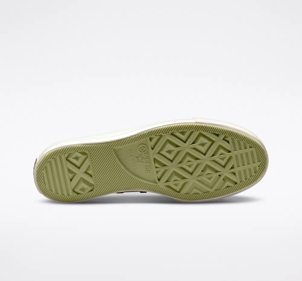 IMPULSO BOTÁNICO. Inspirado en la resiliencia de las flores silvestres, un print floral brillante decora la parte superior de lona de algodón verde tierra de las Chucks con plataforma. Siguiendo con el tema botánico, un estampado floral vivo ilumina la plantilla y la placa de matrícula de inspiración vintage. El cuero sintético viste el refuerzo del talón y la lengüeta, que también presenta un mensaje oculto “Somos más fuertes juntos”. Una entresuela de plataforma de color garceta se completa con un clásico tope de punta con patrón de diamantes.