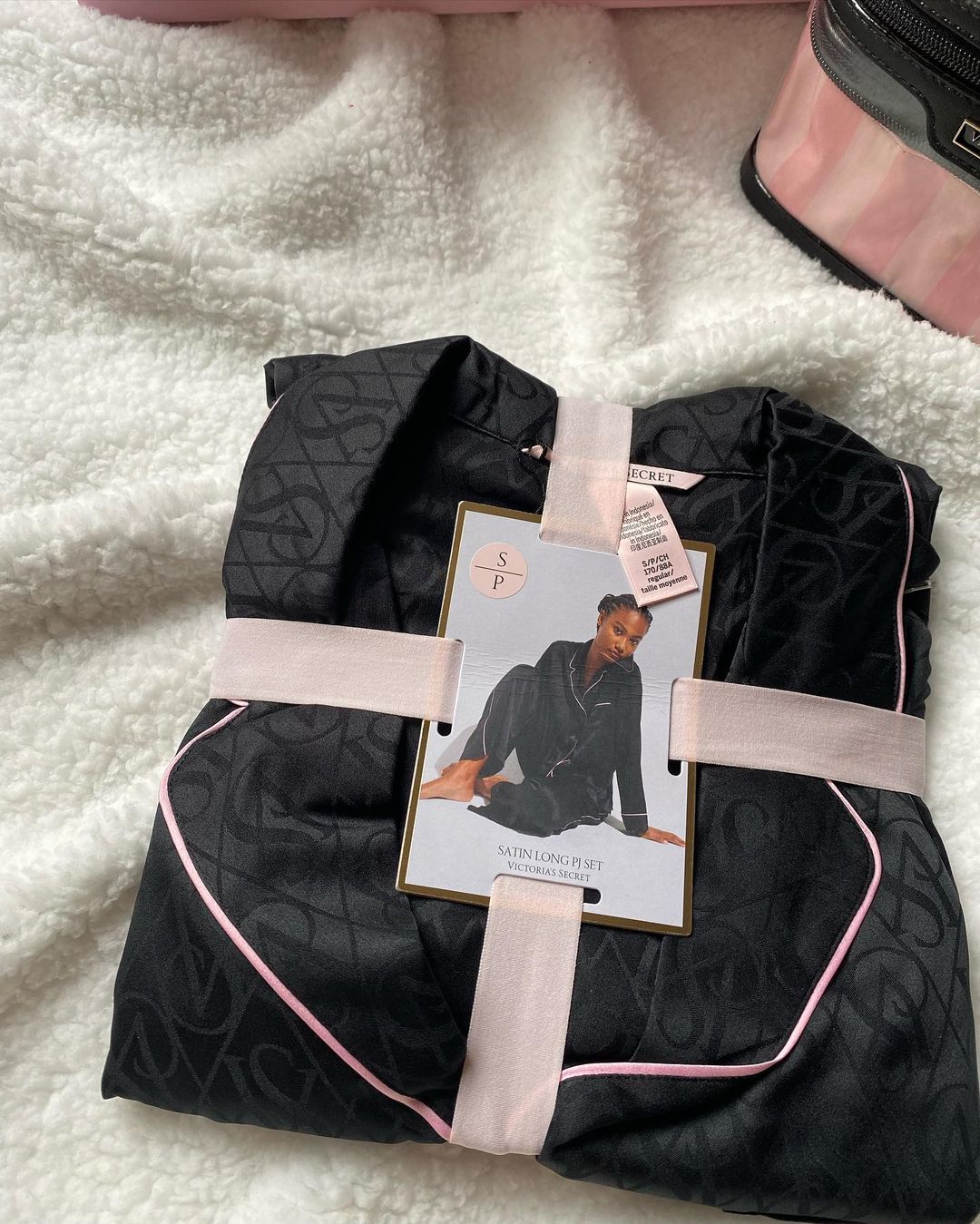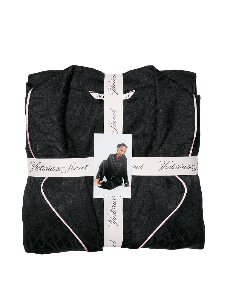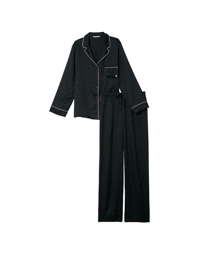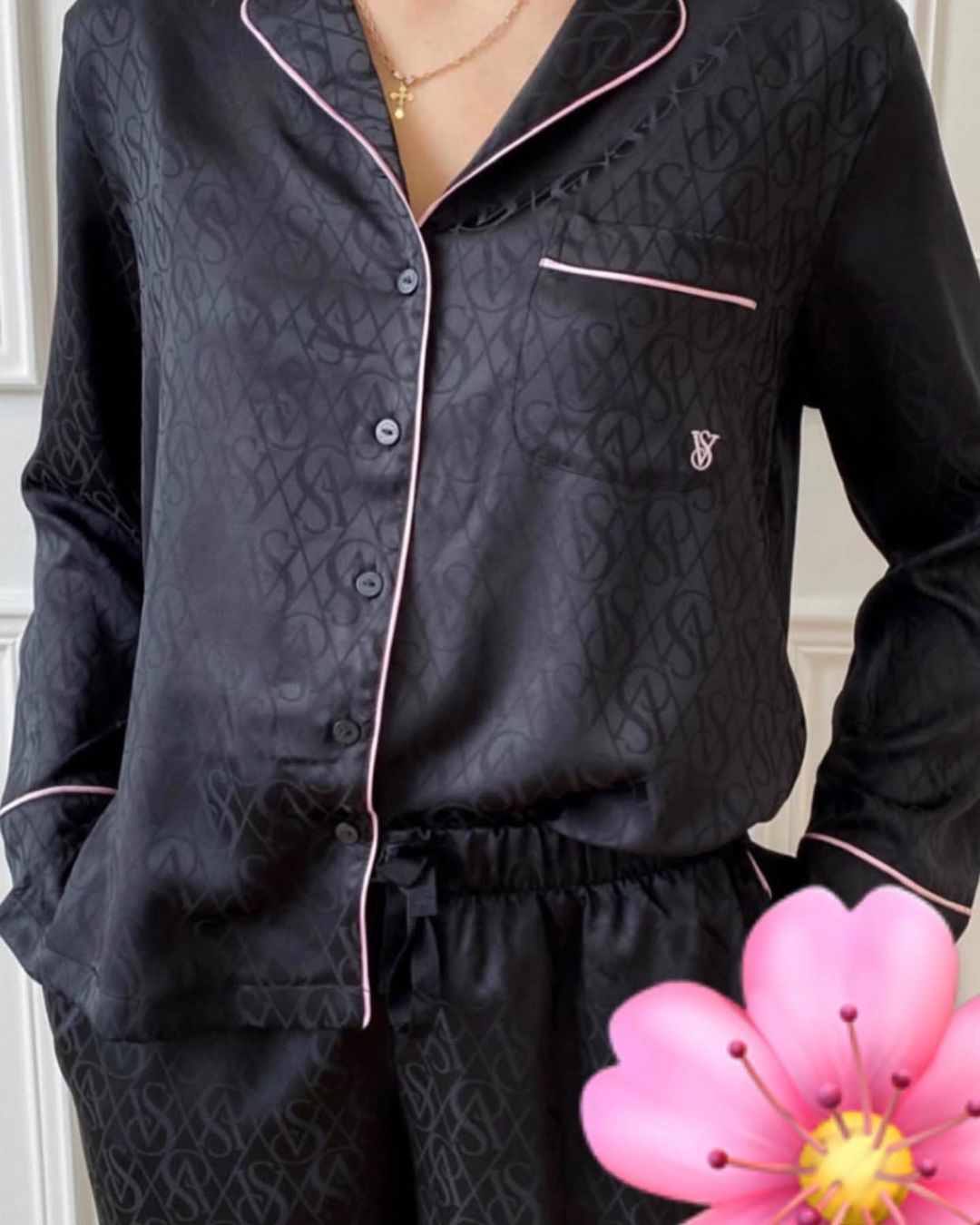 Relajate con este pantalón de satín y una blusa de manga larga a juego con un bolsillo en el pecho, cuello de muesca y ribetes decorativos.