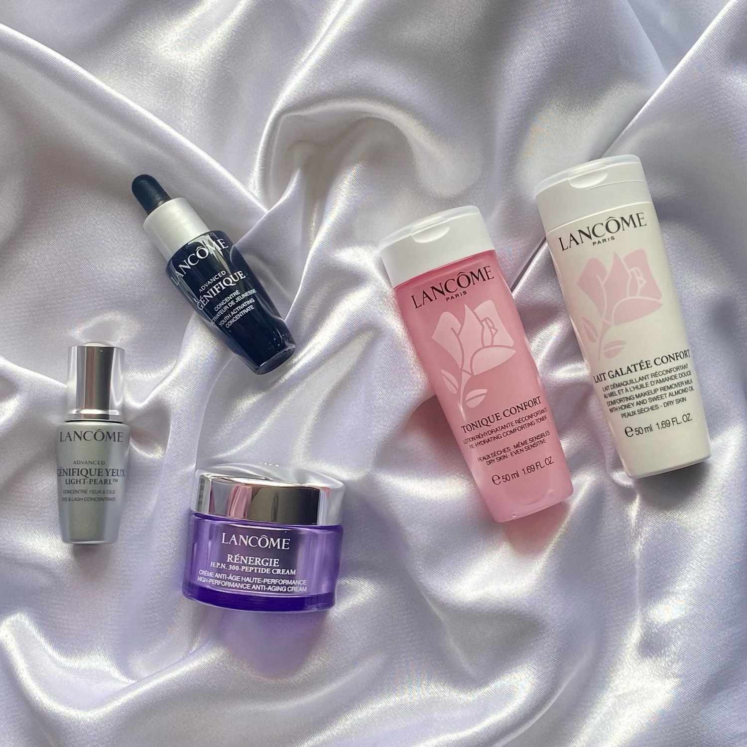 Un set de rutina de cuidado de la piel que contiene sérum facial, crema de día, sérum contorno de ojos, desmaquillante y tónico para conseguir una piel más fuerte y visiblemente más joven.